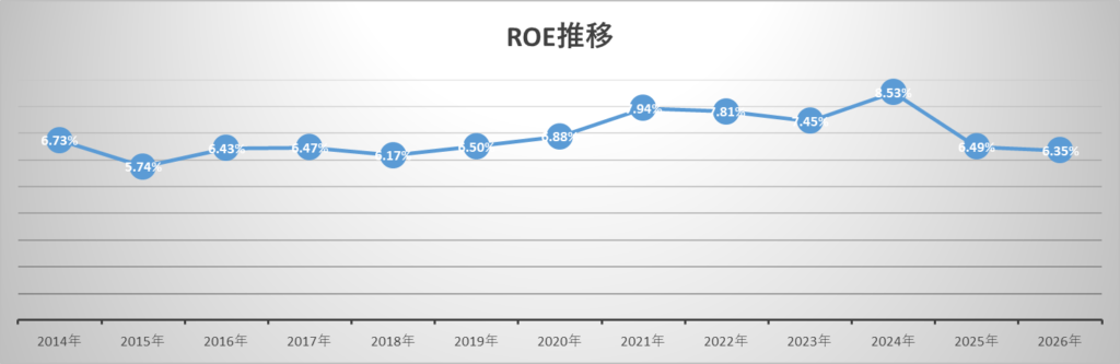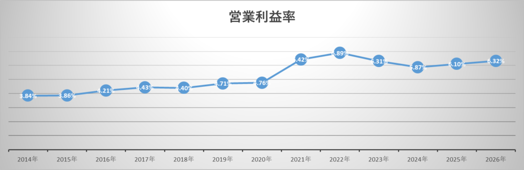 営業利益率は6%前後、ROEも基準にあと一歩という印象なので、数値だけ見れば「圧倒的に優秀な企業」とまでは言いにくいです。