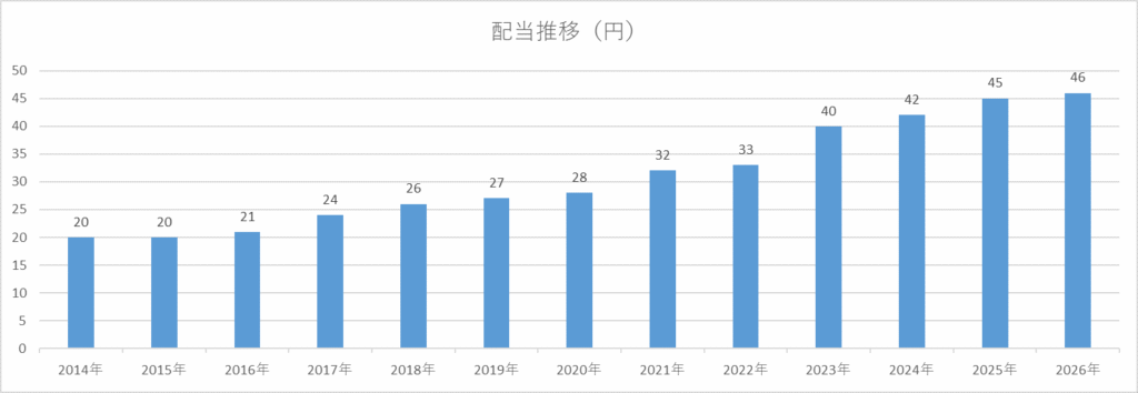 DCMホールディングスの配当は、2014年以降、減配せずに増配傾向が見られる点が魅力です。外部データでも、2014年2月期20円から2026年2月期予想46円まで伸びている流れが確認できます。